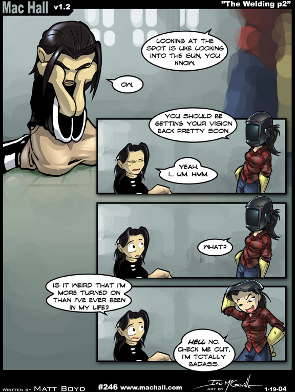 [[Micah is crouched over, both hands covering his eyes. Helen appears as a blur in the foreground.]] Helen: Looking at the spot is like looking into the sun, you know. Micah: Ow. [[Micah is sitting towards the left of the panel, squinting. Helen is standing towards the right, with her welding gear on.]] Helen: You should be getting your vision back pretty soon. Micah: Yeah. I... um. Hmm. [[Same as last panel, except Micah's eyes are wide open.]] Helen: What? [[Same as last panel, except Helen has taken her mask off and is striking a pose.]] Micah: Is it weird that I'm more turned on than I've ever been in my life? Helen: HELL no. Check me out, I'm totally badass.