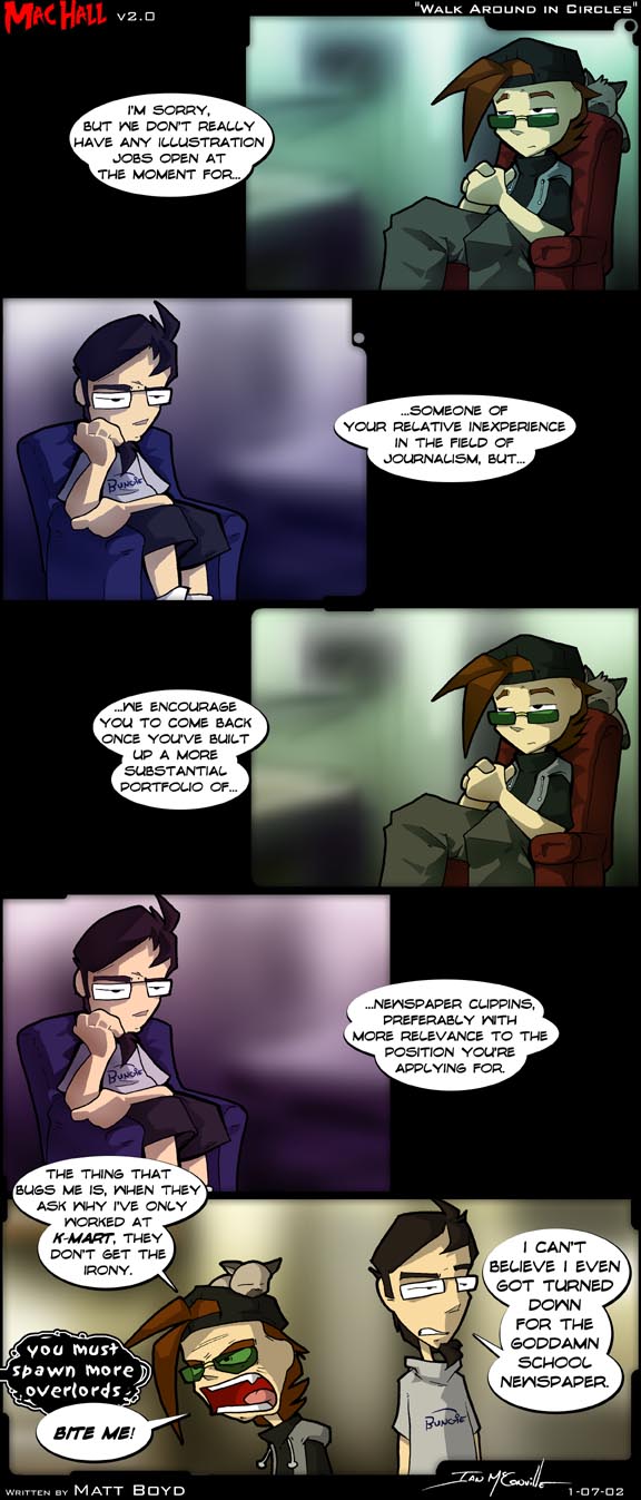 [[Ian and Matt are alternatively shown sitting in recliners, listening to job interviewers, with Ian in the first panel.]] I'm sorry, but we don't really have any illustration jobs open at the moment for... ...someone of your relative inexperience in the field of journalism, but... ...we encourage you to come back once you've built up a more substantial portfolio of... ...newspaper clippins, preferably with more relevance to the position you're applying for. Ian: The thing that bugs me is, when they ask why I've only worked at K-Mart, they don't get the irony. Dark voice: you must spawn more overlords Ian: Bite me! Matt: I can't believe I even got turned down for the goddamn school newspaper.