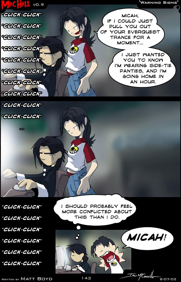 Helen: Micah, if I could just pull you out of your EverQuest trance for a moment... I just wanted you to know I'm wearing side-tie panties, and I'm going home in an hour.