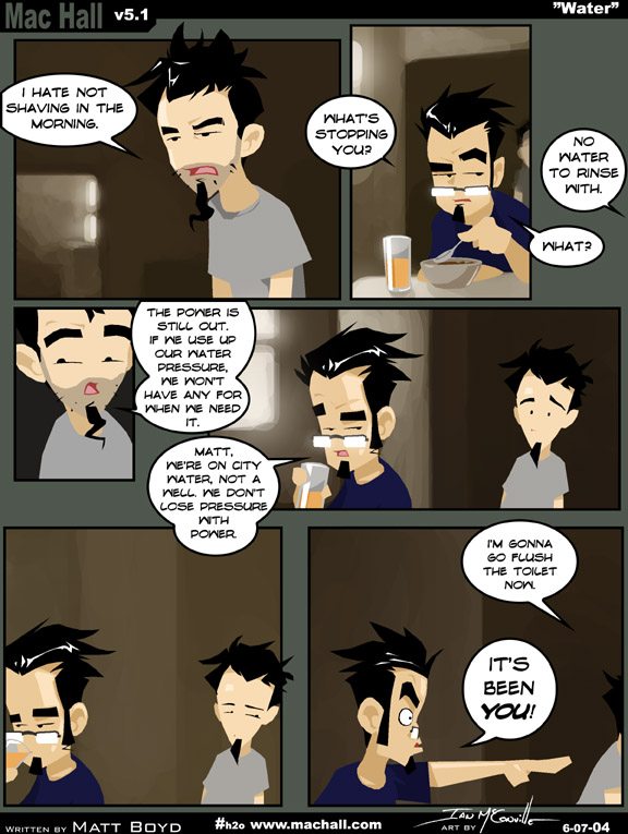 [[Morning at the house. JM is eating cereal when Matt appears. Matt is sleepy and hasn't shaved, unlike usual.]] Matt: I hate not shaving in the morning. JM: What's stopping you? Matt: No water to rinse with. JM: What? Matt: The power is still out. If we use up our water pressure, we won't have any for when we need it. JM: Matt, we're on city water, not a well. We don't lose pressure with power. Matt: I'm gonna go flush the toilet now. JM: It's been you! {{title text: Water}}