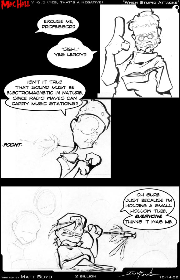 Leroy: Excuse me, professor? Professor: *Sigh...* Yes Leroy? Leroy: Isn't it true that sound must be electromagnetic in nature, since radio waves can carry music stations? <<Foont>> [[Ian is holding a blowgun]] Ian: Oh sure, just because I'm holding a small hollow tube, EVERYONE thinks it was me.