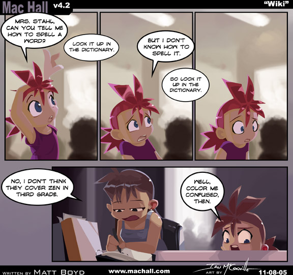 [[In an elementary classroom, Helen's sister raises her hand]] Helen's sister: Mrs. Stahl, can you tell me how to spell a word? Mrs. Stahl: Look it up in the dictionary. Helen's sister: But I don't know how to spell it. Mrs. Stahl: So look it up in the dictionary. [[Helen's sister sits with a perplexed expression on her face.]] [[At Helen's house]] Helen: No, I don't think they cover zen in the third grade. Helen's sister: Well, color me confused, then.