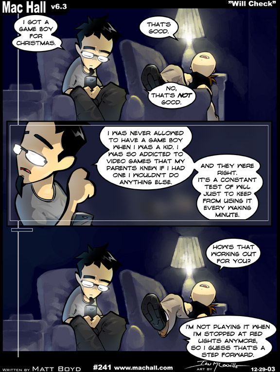 [[Matt is playing video games while Ian is lounging around.]] Matt: I got a Game Boy for Christmas. Ian: That's good. Matt: No, that's NOT good. Matt: I was never allowed to have a Game Boy when I was a kid. I was so addicted to video games that my parents knew if I had one I wouldn't do anything else. And they were right. It's a constant test of will just to keep from using it every waking minute. Ian: How's that working out for you? Matt: I'm not playing it when I'm stopped at red lights anymore, so I guess that's a step forward.