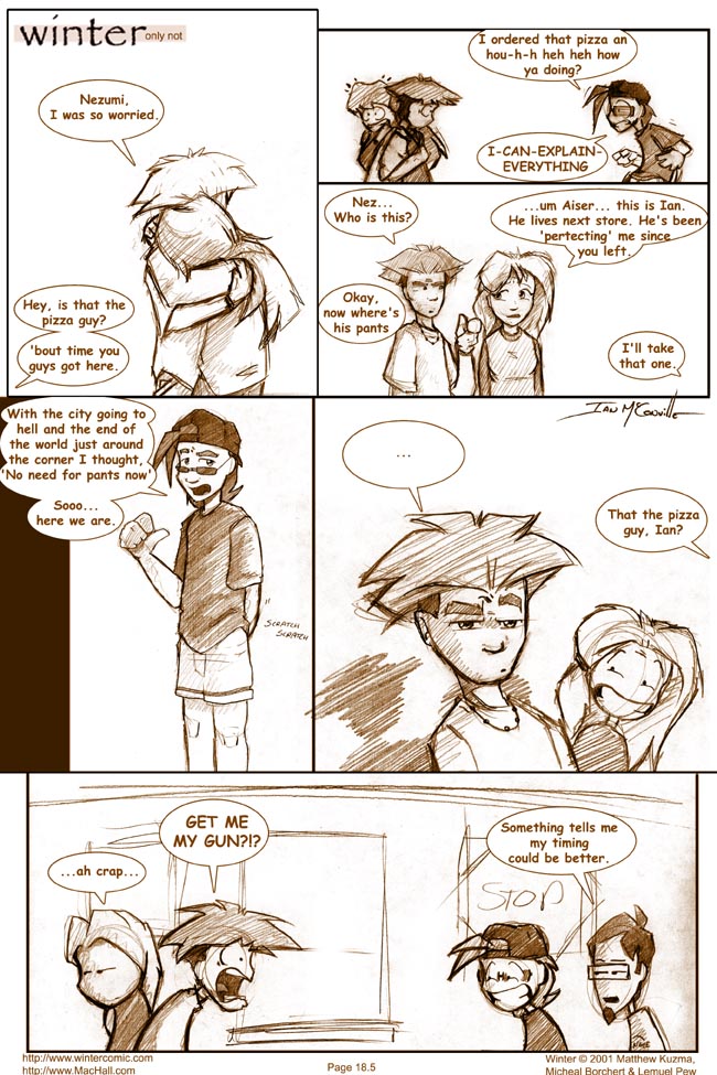 [[Off panel]] Ian: Hey, is that the pizza guy? 'bout tme you guys got