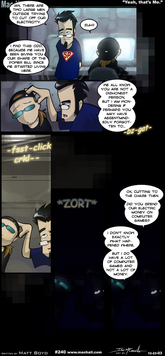 [[Ian sits at a computer, JM stands with his back to Ian]] JM: Ian, there are two large men outside trying to cut off our electricity. I find this odd, because we have been giving you our share of the power bill since we started living here. [[JM grabs Ian's head and rattles it, Ian stares blankly]] JM: We all know you are not a dishonest person, but I am wondering if perhaps you may have absentmindedly forgotten to??? <<-bz-gat->> [[JM and Ian look up]] <<-fsst-click-crkl-->> [[Power goes out]] <<*ZORT*>> JM: Ok, cutting to the chase then. Did you spend our electric money on computer games? Ian: I don't exactly know what happened where, but I do have a lot of computer games and not a lot of money.